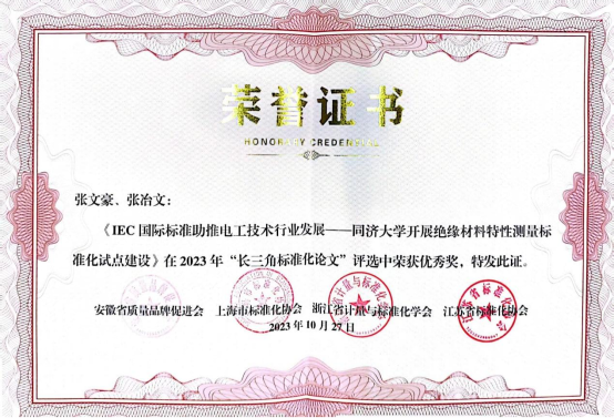 此外,长三角三省一市标准化协会为进一步推动实施标准化战略,持续深化标准化工作改革,组织征集了2023年“长三角标准化论文”,必赢官网电工技术团队通过标准化与科技创新互动发展,凝练成果,撰写了题为《IEC国际标准助推电工技术行业发展——必赢3003no1线路检测中心开展绝缘材料特性测量标准化试点建设》的总结论文,在10月30日举办的第54届”世界标准日“中荣获优秀奖。