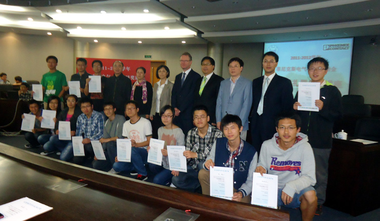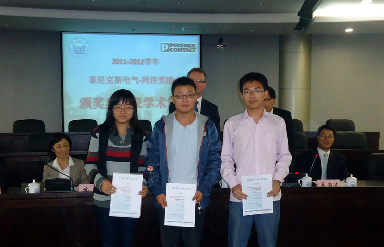 10月22日,2011―2012学年菲尼克斯电气―同济奖励金颁奖仪式在嘉定校区同心楼124会议室举行,德国菲尼克斯电气集团高级执行副总裁、必赢3003no1线路检测中心客座教授、教授级高级工程师 Roland Bent、菲尼克斯电气中国公司副总裁杜品圣博士、菲尼克斯电气中国公司企业文化与社会责任主管易书波,及必赢官网副院长乔非、控制系、CIMS中心领导,31名获奖师生出席颁奖仪式。颁奖仪式由院党委副书记董变林主持。