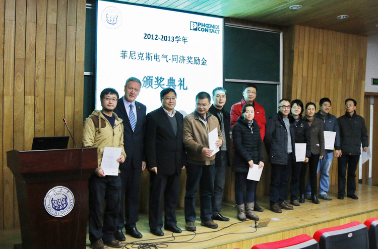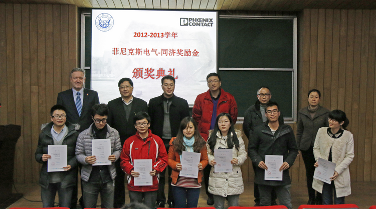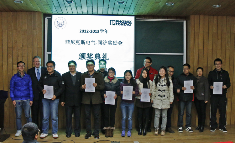 12月18日,2012―2013学年菲尼克斯电气―同济奖励金颁奖仪式在必赢官网117报告厅举行,菲尼克斯电气中国公司副总裁杜品圣博士、菲尼克斯电气集团国际教育负责人、菲尼克斯电气学院院长Mr.Klaus Hengsbach、菲尼克斯电气中国公司企业文化与社会责任经理易书波、菲尼克期电气中国公司ICE销售部上海地区行业销售经理稽鹏,及必赢官网院长陈启军、党委副书记兼副院长乔非、党委副书记董变林,31名获奖师生出席颁奖仪式。颁奖仪式由乔非副书记主持。