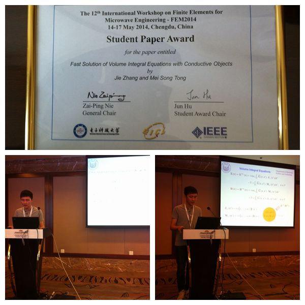近日,必赢官网电子科学与技术系10级本科生张杰同学受邀参加在成都举办的国际著名学术会议“The 12th International Workshop on Finite Elements for Microwave Engineering”(第12届微波工程有限元国际研讨会)”,他在“矩量法与积分方程解器”分会场作了题为“Fast Solutions of Electromagnetic Volume Integral Equations with Conductive Media(导电性介质电磁体积分方程的快速解)”的大会口头报告,受到与会代表的好评,事后被多位国际著名教授誉为“good job”。该论文是张杰同学在系主任童美松教授精心指导下完成并在今年一月份投稿、三月份正式接受的。会上大会技术委员会成员根据论文内容和口头报告质量进行打分评审,最终该论文被评为最佳论文之一。