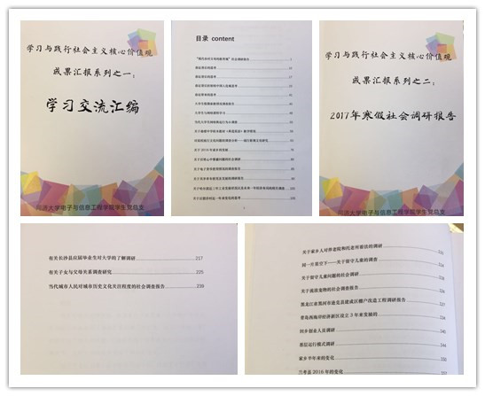 在践行社会主义核心价值观的2017年寒假调研活动开展前,学生党总支就设计了《认识你所在的中国》专题授课和讨论,并组织学生阅读相关的经典著作,让学生了解学者眼中的中国,并引导学生从学者的角度思考中国,并提供社会调查方法的著作、案例给学生参考,让学生在寒假展开认识中国的调研活动。大学生们用自己独特的视角去观察社会,了解国情民意,他们不仅关注民生问题,比如雾霾、春运,也关心社会问题,比如共享单车、电子货币;同样的,作为从外地来沪的大学生,他们同样关心家乡的建设和发展,同时他们也关注自身作为大学生群体的所思所想所为;当然,作为一名中国人,也关心着国家的运作和发展,比如基层民主制度的运作机制、地区经济布局等等。
