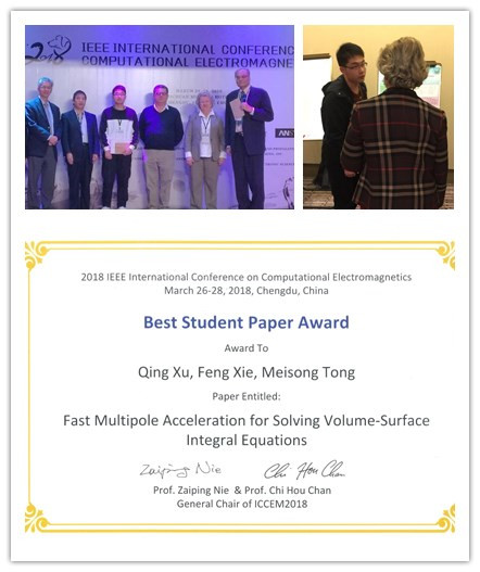 近日,必赢官网电子科学与技术系2017级硕士研究生徐卿受邀参加在成都举办的国际著名学术会议“2018 IEEE International Conference on Computational Electromagnetics (2018年IEEE计算电磁学国际会议)”,他在专门设置的“Competition for the Best Papers of Students(学生最佳论文竞赛)”分会场作了题为“Fast Multipole Acceleration for Solving Volume-Surface Integral Equations(求解体–面积分方程的快速多极子加速方法)”的海报展示,受到竞赛评委和观众的好评,事后被多位国际著名教授誉为“interesting work”及“excellent job”。