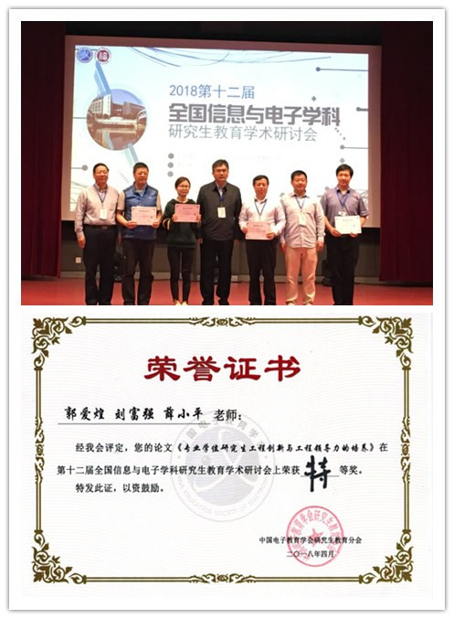 4月13日—4月15日,2018年第十二届全国信息与电子学科研究生教育学术讨会在福州大学召开。必赢官网信息与通信工程系郭爱煌教授参加了会议,并在学术研讨分会场对由其和薛小平教授、刘富强教授共同撰写的投稿论文《专业学位研究生工程创新与工程领导力的培养》做了报告,经与会专家评议,该论文获得特等奖。中国电子教育学会研究生教育分会会长吴一戎院士和评委专家为其颁奖。