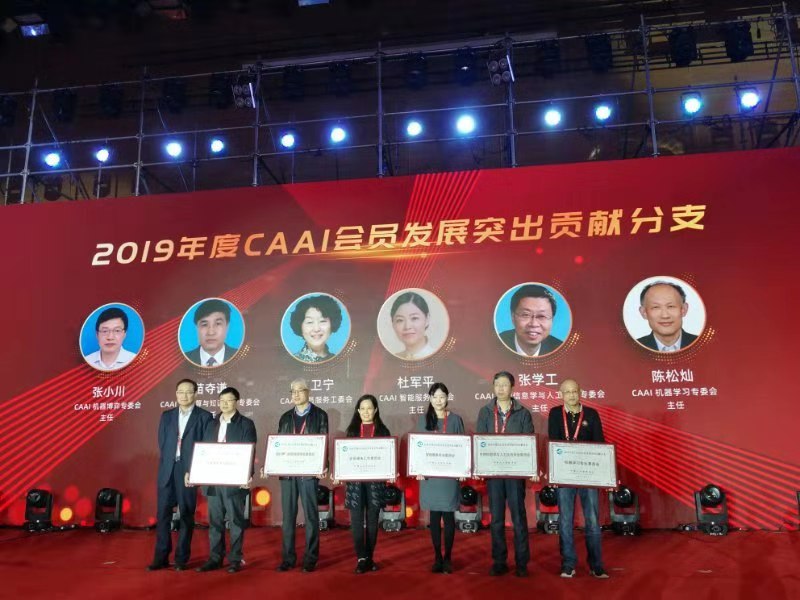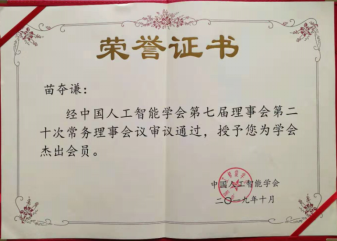 会上,苗夺谦教授被中国人工智能学会授予第七届理事会杰出贡献奖和中国人工智能学会杰出会员奖,受到学会表彰。